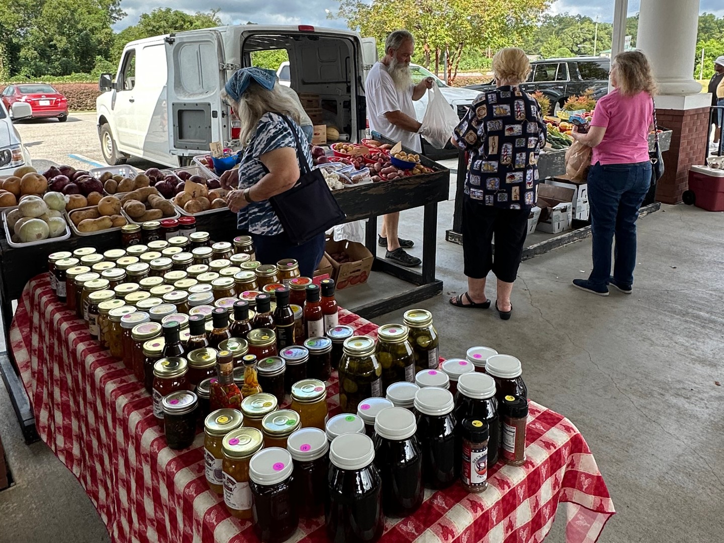 This is the Aggieland Farmers Market located in the Post Oak Mall parking lot in front of Murdoch’s. We are open every Saturday rain or shine. We are an 80-20 market, so 80% farmers and 20% others. There are all kinds of items to get like fresh veggies, meats, jams & jellies, all kinds of fresh bread, baked goodies, freeze dried products and live music.