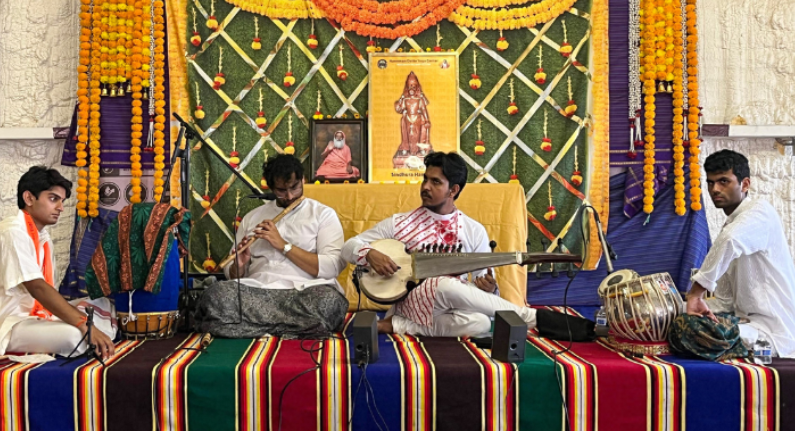Carnatic flute artist Srikar Satish, violinist Pranav Praveen, and mridangam artist Datta Mullapudi present a South Indian classical music concert. The performance features melodic compositions and improvisation, highlighting the interplay between flute, violin, and percussion.