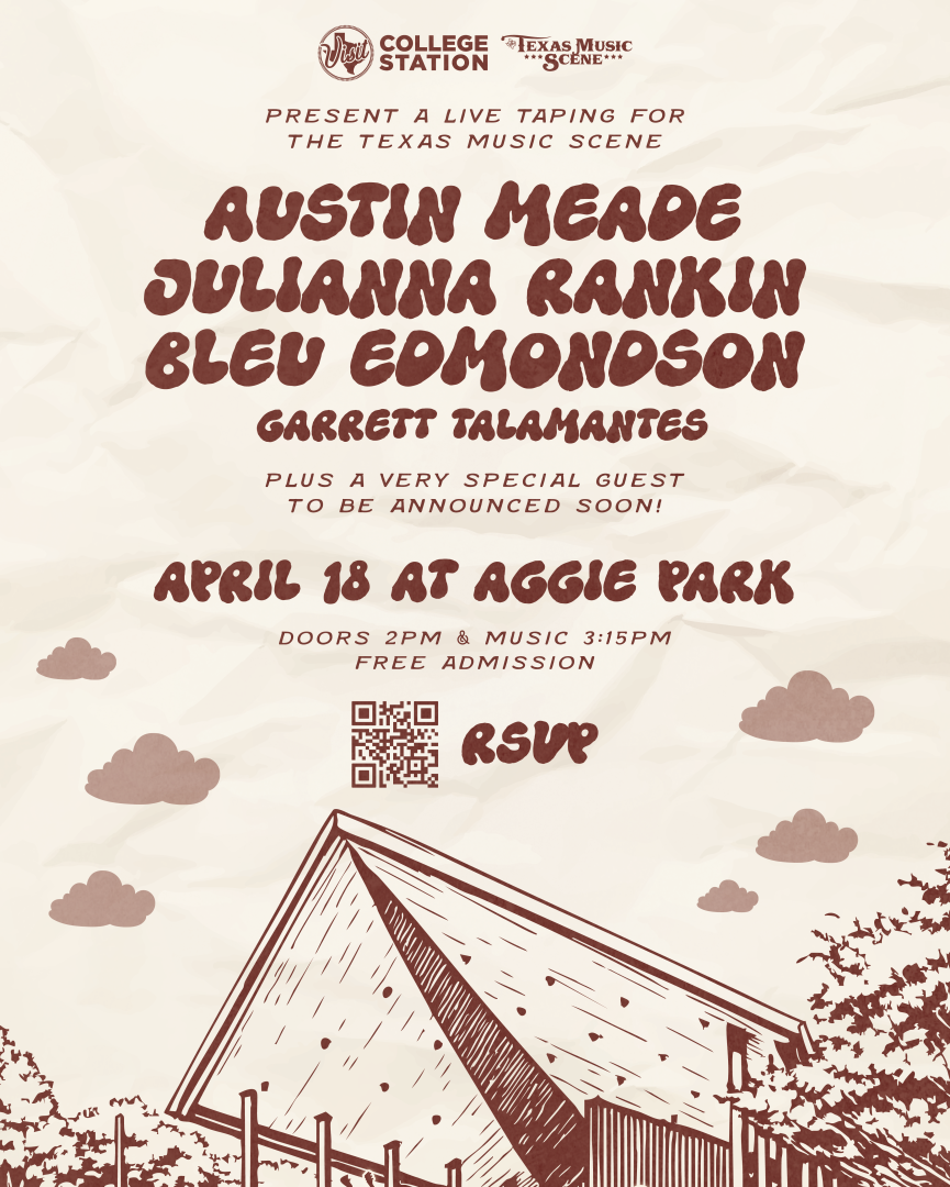 Spend your Saturday in Aggieland with the perfect mix of game day energy and live music as Visit College Station partners with Forefront Studios for a FREE live taping of Texas Music Scene TV at Aggie Park on April 18. Following the Maroon & White Spring Game at Kyle Field (1 PM kickoff), head over to Aggie Park where gates open at 2 PM and the show begins at 3:15 PM. The lineup features a strong group of Aggie artists including Garrett Talamantes (G1 Rodeo Show), The Bleu Edmondson Band, Julianna Rankin and Austin Meade, with one more special guest still to come. Bring your chairs and blankets, settle in and be part of a live audience that brings College Station’s music scene to a national stage.